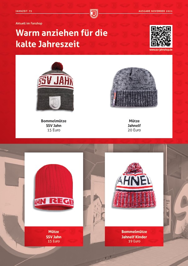 JAHNZEIT 75 AUSGABE NOVEMBER 2021 www.ssv-jahnshop.de Aktuell im Fanshop Warm anziehen für die kalte Jahreszeit Bommelmütze SSV Jahn 15 Euro Mütze Jahnelf 20 Euro Bommelmütze Jahnelf Kinder 19 Euro Mütze SSV Jahn 15 Euro